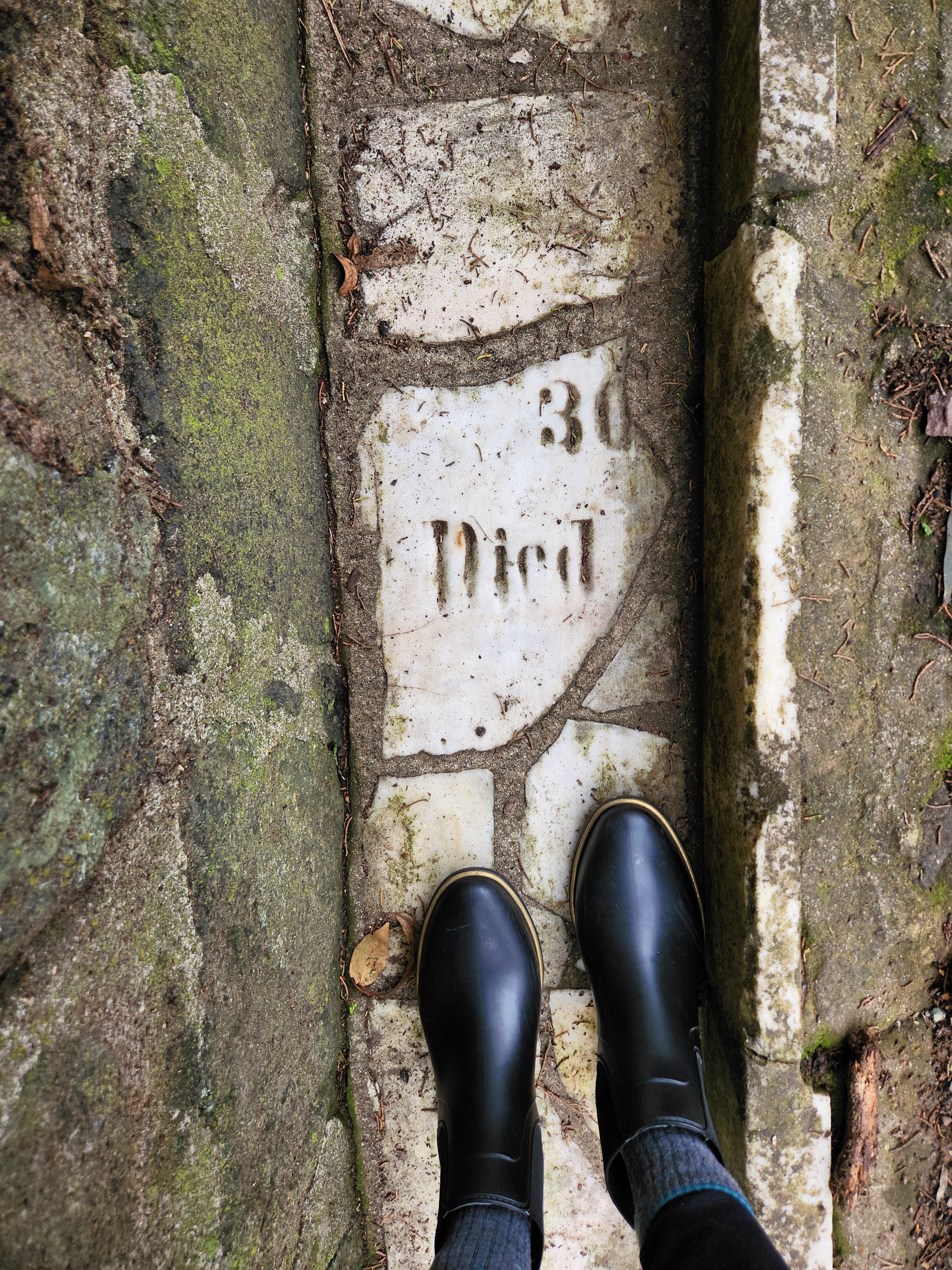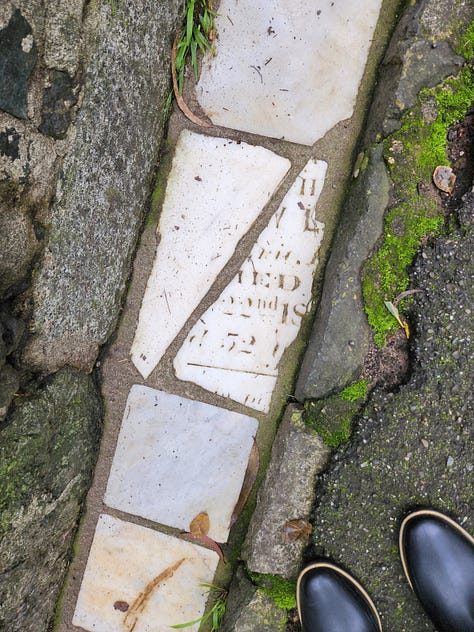 WPA workers used these marble remnants to beautify the park’s rain gutters. The majority of broken grave markers were positioned face down, but a handful of them face up. You can make out bits of the carved epitaphs still today.